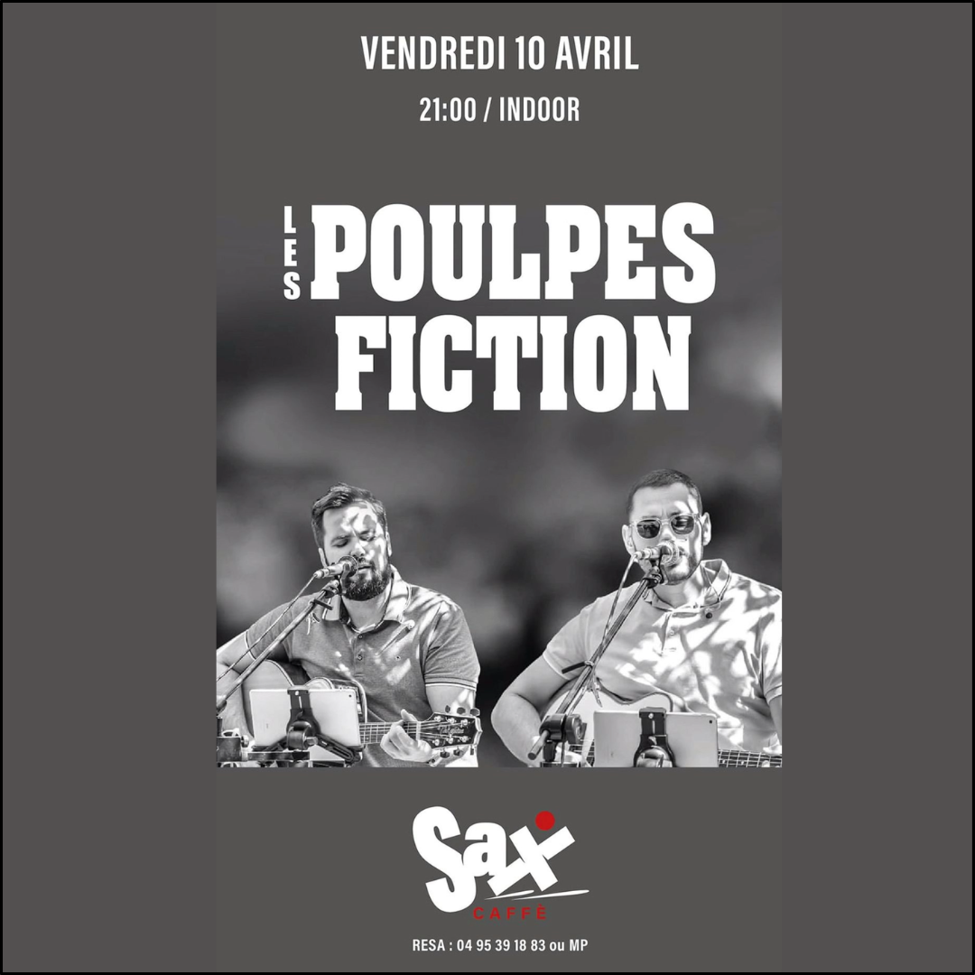 Retrouvez le groupe Poulpes Fiction ce vendredi 10 avril à partir de 21h00 au Sax Caffè. Réservations au 04 95 39 18 83