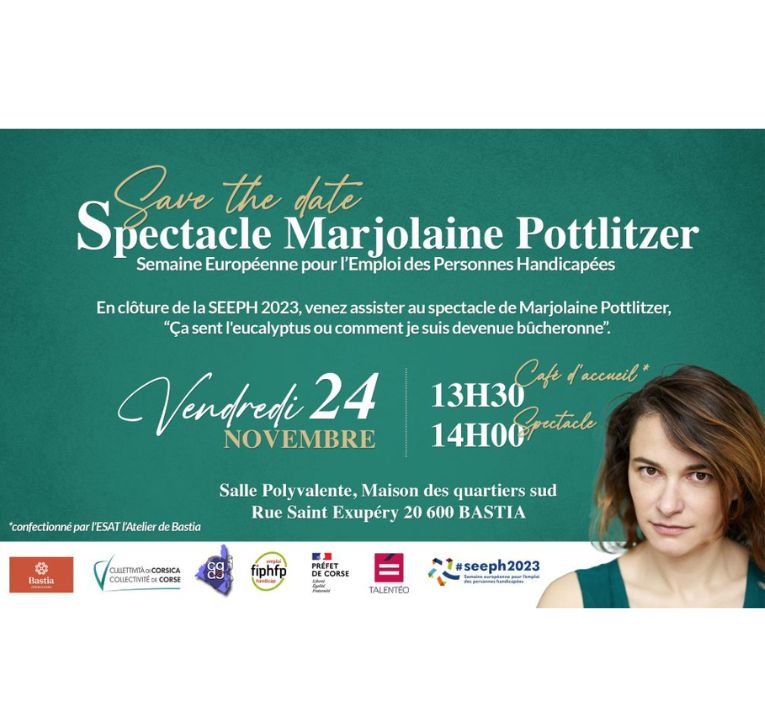 En clôture de la Semaine Eruopéenne pour l’Emploi des Personnes Handicapées, le vendredi 24 novembre à partir de 13h30 pour le café d’accueil, nous vous proposons un spectacle avec Marjolaine Pottlizer cofinancé par la Collectivité de Corse, La Préfecture de Corse, La Mairie de Bastia et le Centre Départemental de Gestion de la Fonction Publique de Haute Corse (CDG 2B), en partenariat avec le FIPHFP.