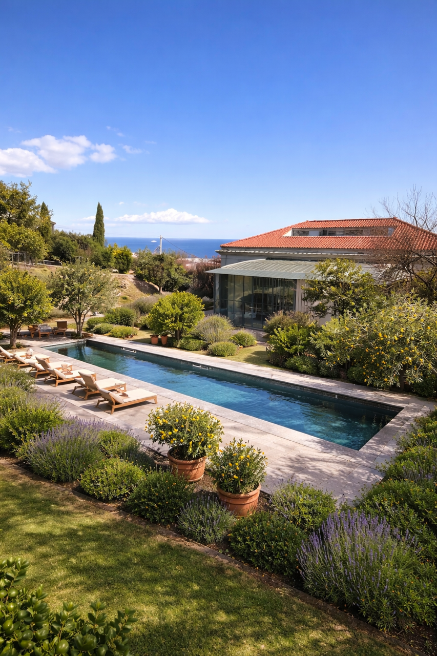 Plus haut dans le jardin, la piscine surplombe Bastia et la Méditerranée. Quelques transats, le parfum des agrumes et le soleil de l’après-midi composent un refuge suspendu entre ciel et mer.